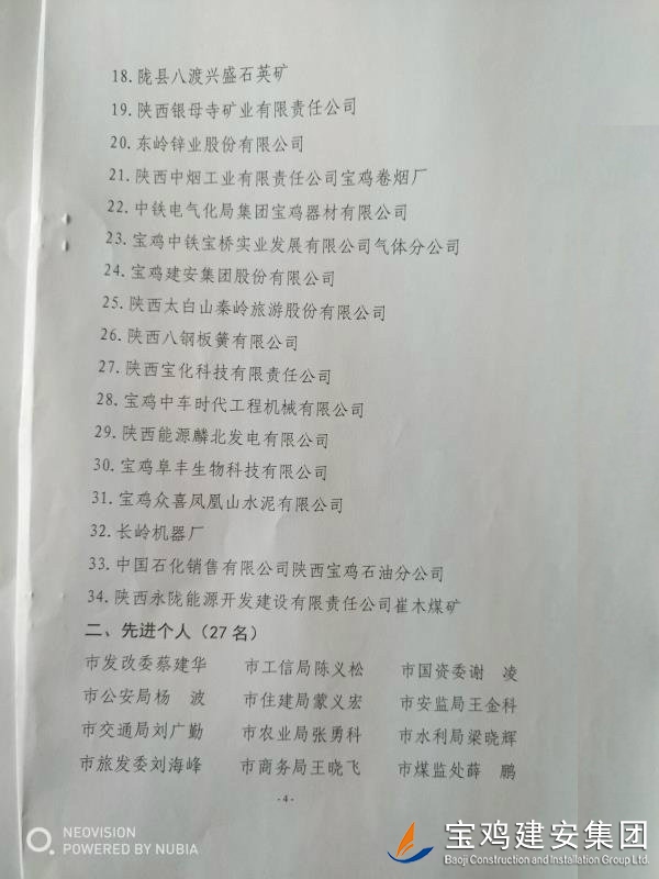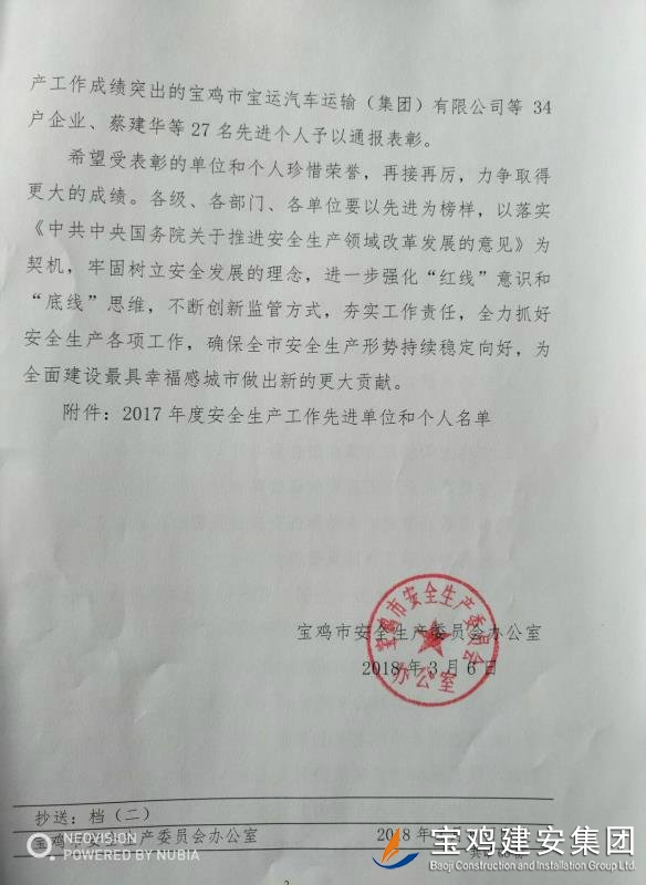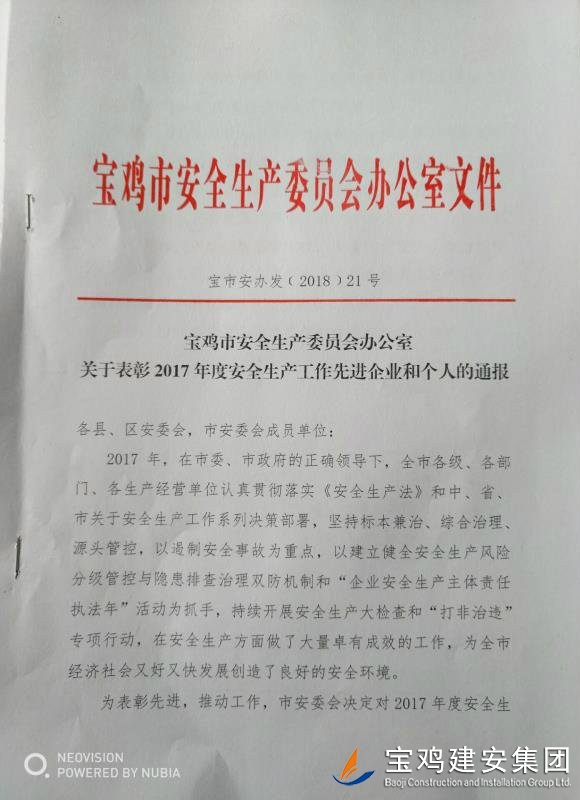 近期,寶雞市安委會(huì)對(duì)2017年度安全生產(chǎn)先進(jìn)單位進(jìn)行了通報(bào),我單位在考核中以優(yōu)異的成績(jī)獲得了此項(xiàng)殊榮。當(dāng)然,取得這樣的成績(jī),離不開(kāi)各級(jí)領(lǐng)導(dǎo)的正確決策和基層單位的艱辛付出,公司安委會(huì)在此表示感謝。 2017年,公司始終圍繞在國(guó)家的大政方針框架下,積極展開(kāi)以《安全生產(chǎn)法》及相關(guān)規(guī)范標(biāo)準(zhǔn)為核心的安全工作,堅(jiān)持標(biāo)本兼治、綜合治理、源頭管控,以遏制安全事故為重點(diǎn),建立健全安全生產(chǎn)風(fēng)險(xiǎn)分級(jí)管控與隱患排查治理雙重機(jī)制,持續(xù)開(kāi)展安全生產(chǎn)專項(xiàng)檢查,杜絕了惡性事故的發(fā)生。在安全生產(chǎn)標(biāo)準(zhǔn)化建設(shè)中,公司始終以“科技創(chuàng)新、合理投入、擇善而從”為出發(fā)點(diǎn)進(jìn)行部署管理,通過(guò)系統(tǒng)管理及一系列舉措,使公司安全管理走在本土行業(yè)前列,且在多次檢查驗(yàn)收中,獲得省、市級(jí)領(lǐng)導(dǎo)的點(diǎn)贊。 九牛一毫莫自夸 驕傲自滿必翻車(chē),成績(jī)只代表過(guò)去,2018年,我們要完善不足,戒驕戒躁,砥礪前行。 寶雞建安集團(tuán)股份有限公司安委會(huì) 2018年4月25日