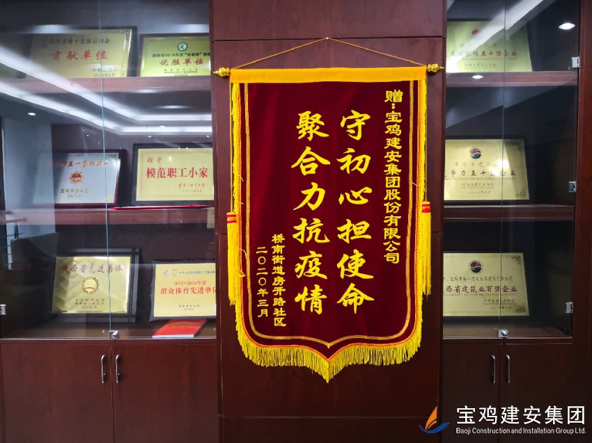 4月1日上午,寶雞建安大廈21樓舉行了一場簡單而熱烈的贈(zèng)旗活動(dòng)。橋南街道辦事處房開路社區(qū)馮書記、王主任等三人代表社區(qū)所管轄的廣大居民,給寶雞建安集團(tuán)股份有限公司送來一面“守初心擔(dān)使命、聚合力抗疫情”的錦旗,贊揚(yáng)寶雞建安集團(tuán)公司在新冠肺炎疫情防控工作中對社區(qū)工作的支持和幫助。公司黨委書記、總經(jīng)理、工會(huì)主席等參加活動(dòng)。