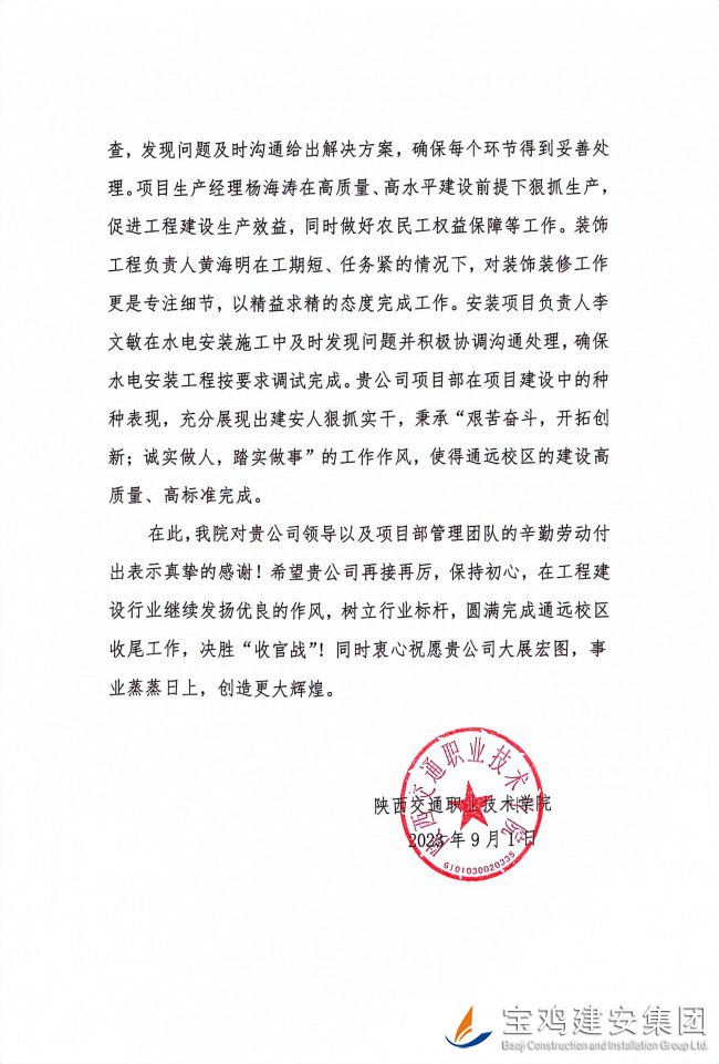 據(jù)悉,陜西交通職業(yè)技術學院新校區(qū)一期建設項目【EPC】一標段建筑面積為48200.59平方米,工程造價3.4億。合同工期為2021年11月25日至2023年7月7日總工期600天,實際開工日期為2022年5月4日,經(jīng)過一年多的施工,現(xiàn)已完成教學樓和室外工程全部施工內(nèi)容,并于2023年9月1日正式投入使用。